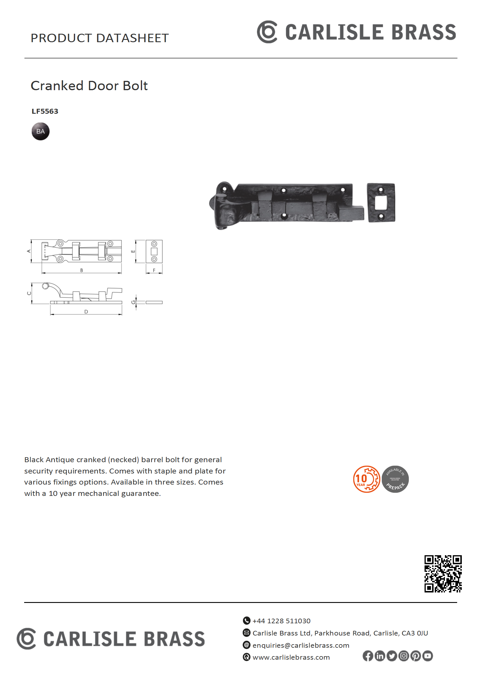 Black Antique cranked (necked) barrel bolt for general security requirements. Comes with staple and plate for various fixings options. Available in three sizes. Comes with a 10 year mechanical guarantee. Suitable for domestic use. Ludlow Black Antique is a traditional range of furniture with a powder coated Black finish.