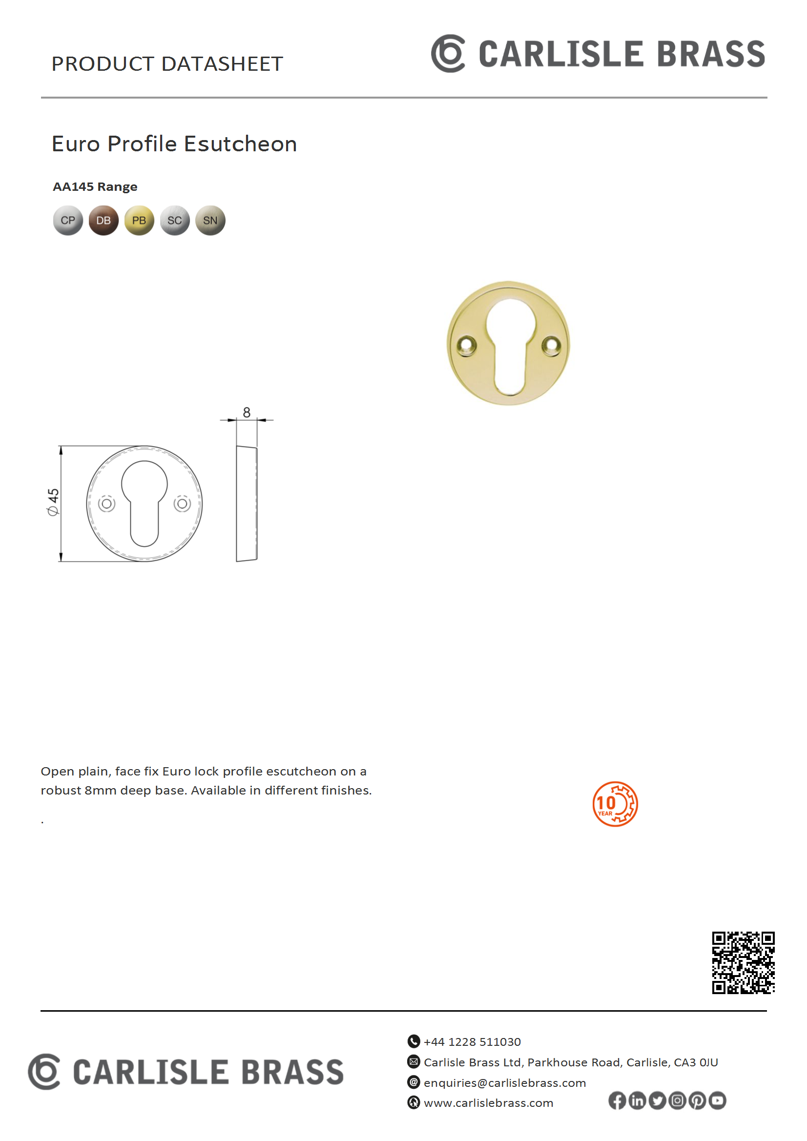 Open plain, face fix Euro lock profile escutcheon on a robust 8mm deep base. Available in different finishes.