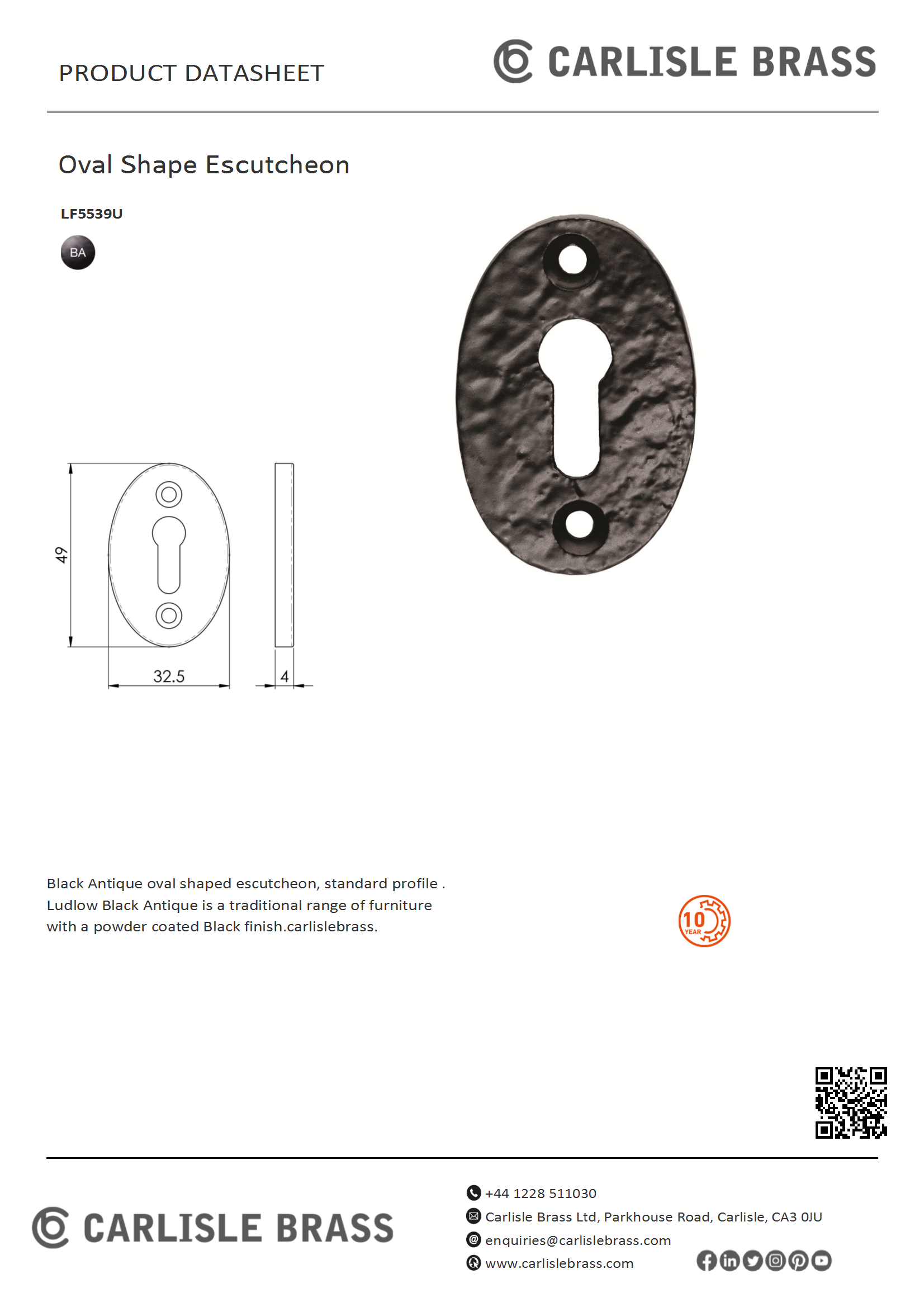 Black Antique oval shaped escutcheon, standard profile . Ludlow Black Antique is a traditional range of furniture with a powder coated Black finish.