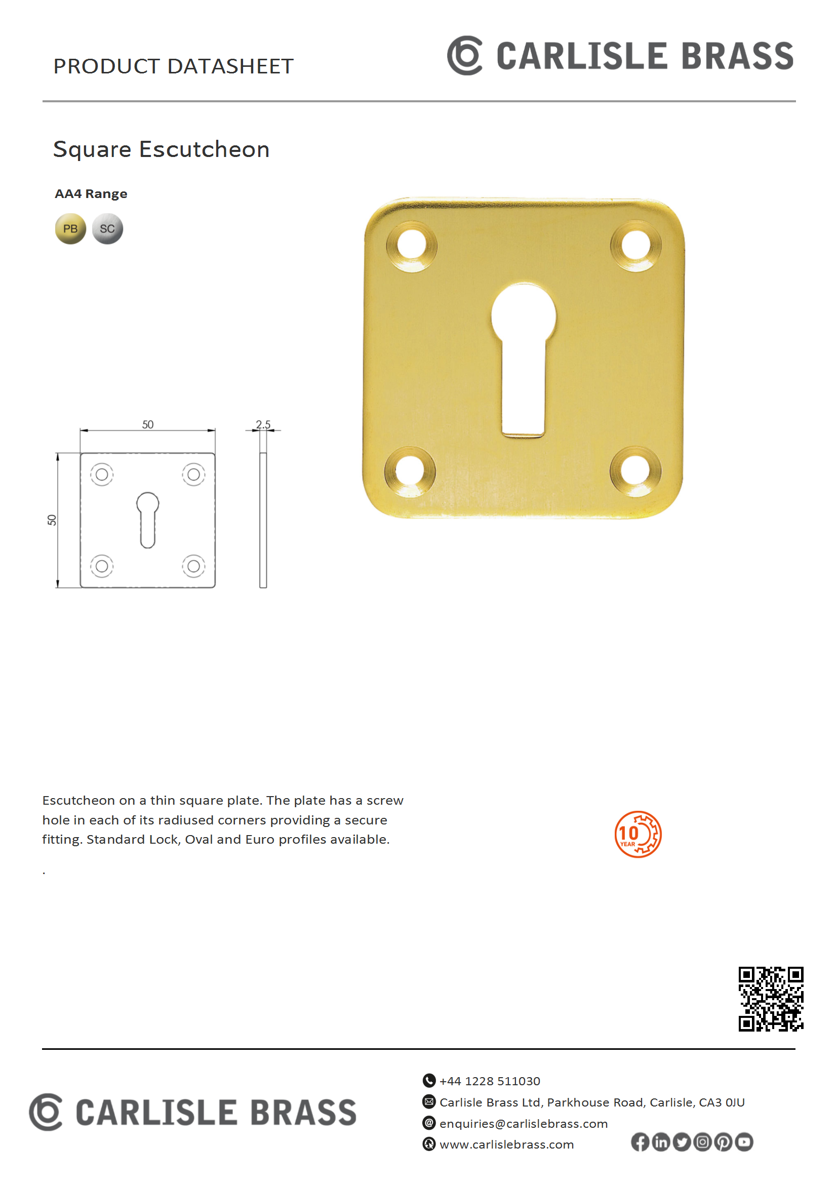 Escutcheon on a thin square plate. The plate has a screw hole in each of its radiused corners providing a secure fitting. Standard Lock, Oval and Euro profiles available.